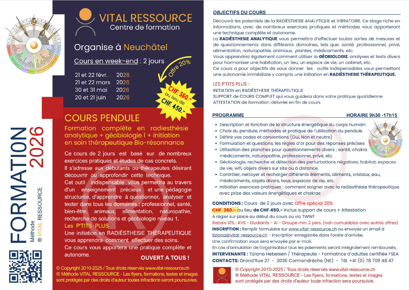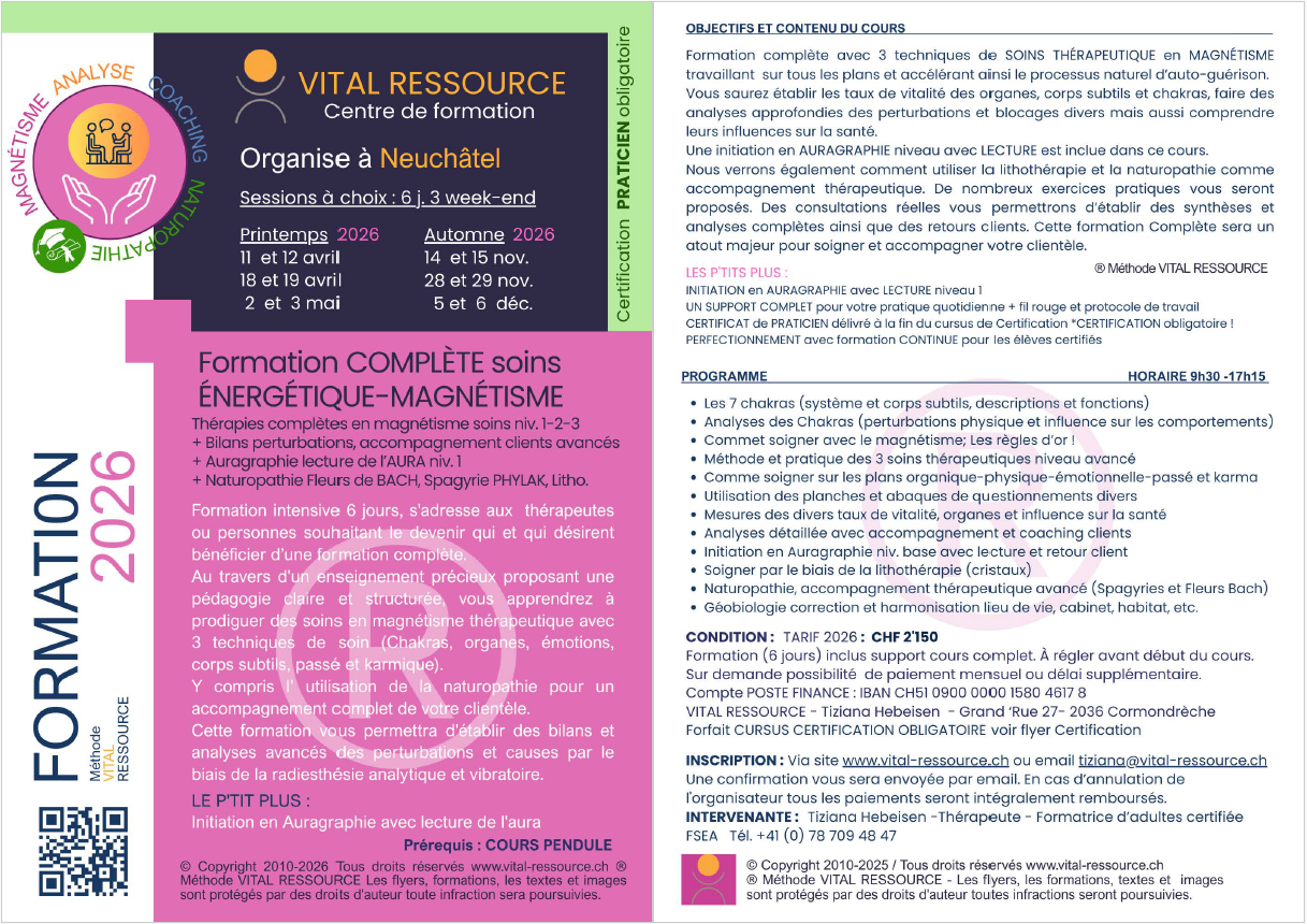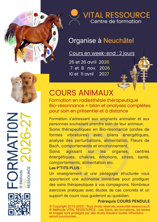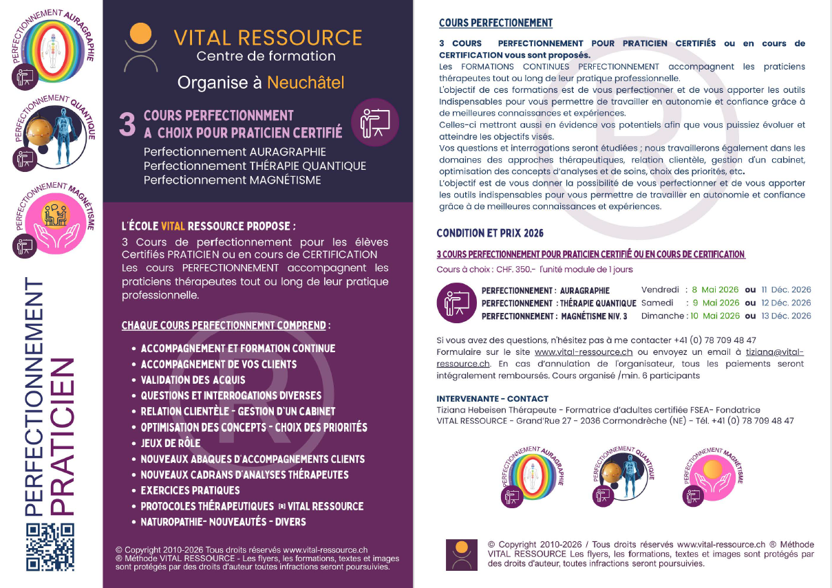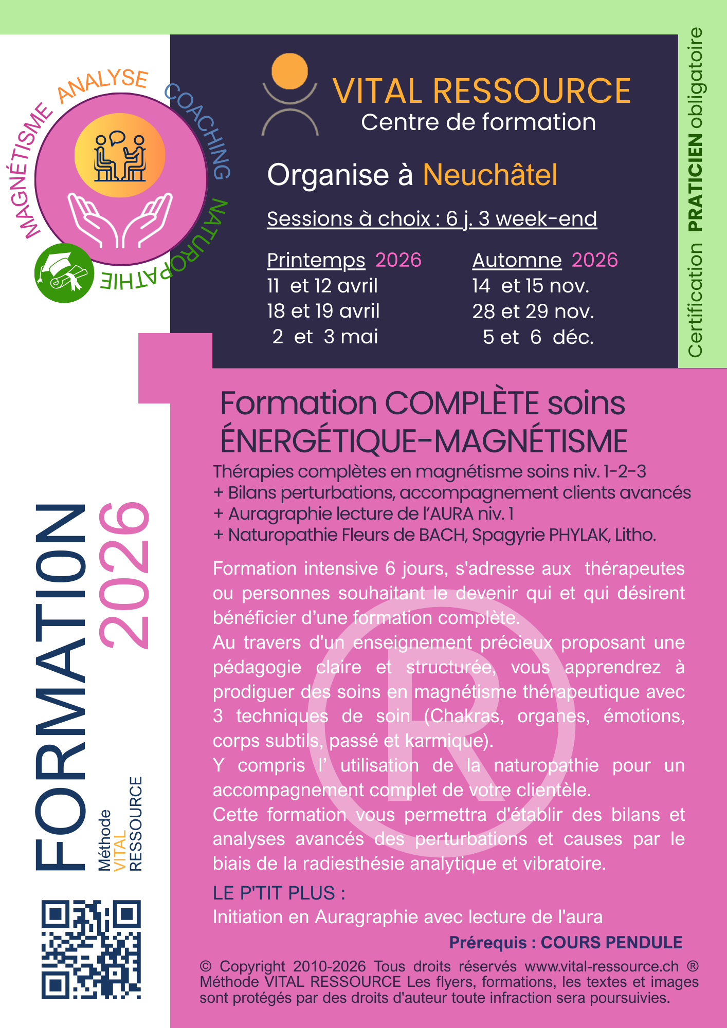 Pour celles et ceux qui souhaitent se professionnaliser, vous trouverez dans l’éventail des cours proposés, le bagage nécessaire et un accompagnement individuel tout au long de votre formation pour accéder au statut de Praticien-Thérapeute.